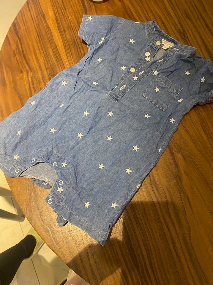Kısa kollu, düğmeli ve nakışlı yıldız desenli mavi denim tulum, rahat kesim. Sokak modasına uygun.