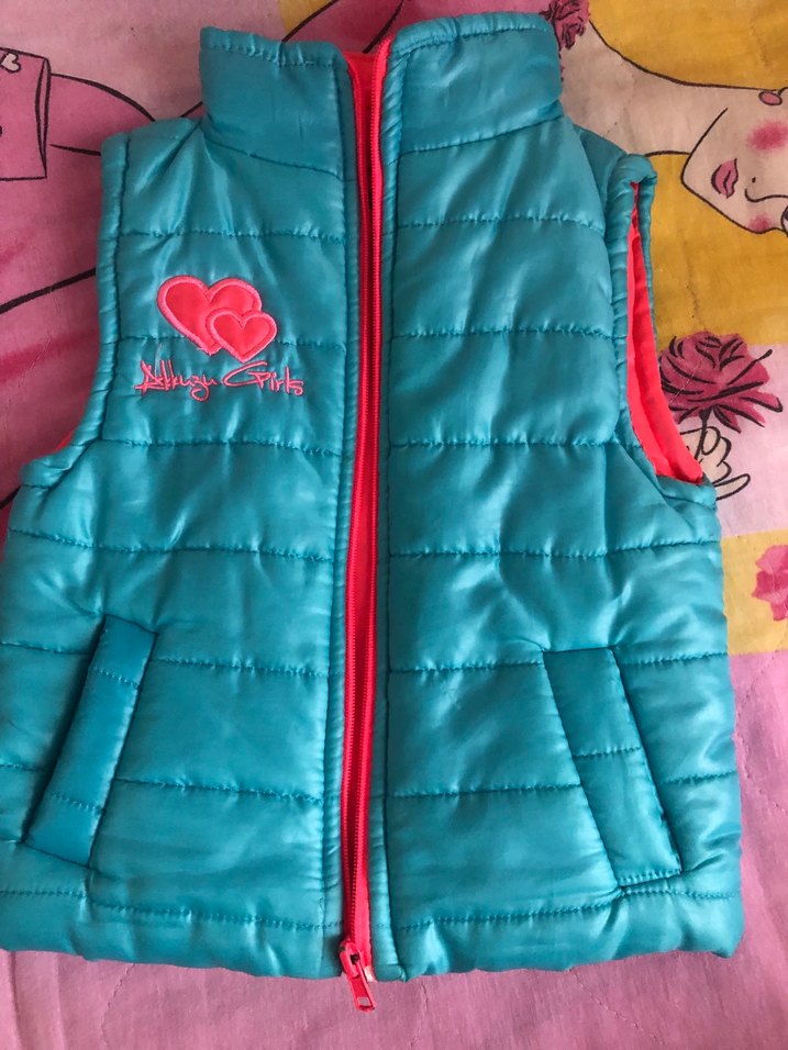 Mavi renkli, nakışlı kalp deseni ve ön fermuarlı, kolsuz, dar kesim kız çocuk yeleği.3 yaşa uygun