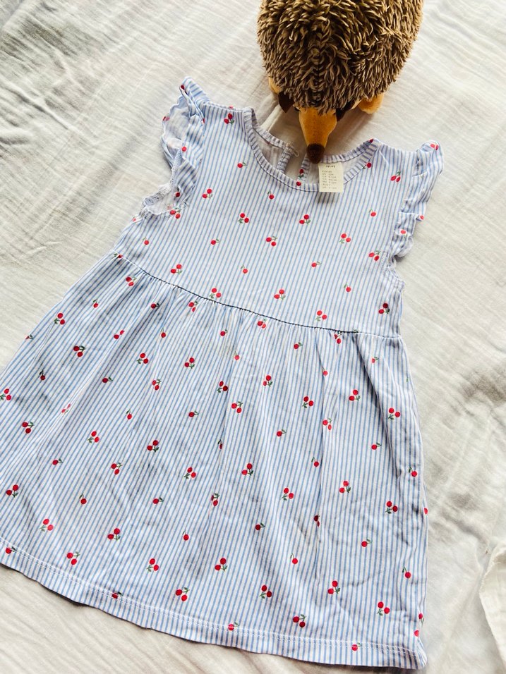 Pamuklu, kısa kollu, V yaka, nakışlı ve fırfırlı detaylı mavi kız çocuk elbisesi. Bol kesim, bohem tarzında.