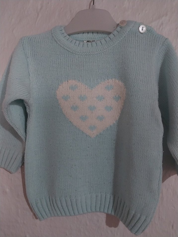 Pastel mavi renkte, örgü kumaştan yapılmış kız çocuk kazak. Yuvarlak yaka, uzun kollu, bol kesim ve nakışlı kalp deseni bulunur. Omuzda düğme detaylıdır.