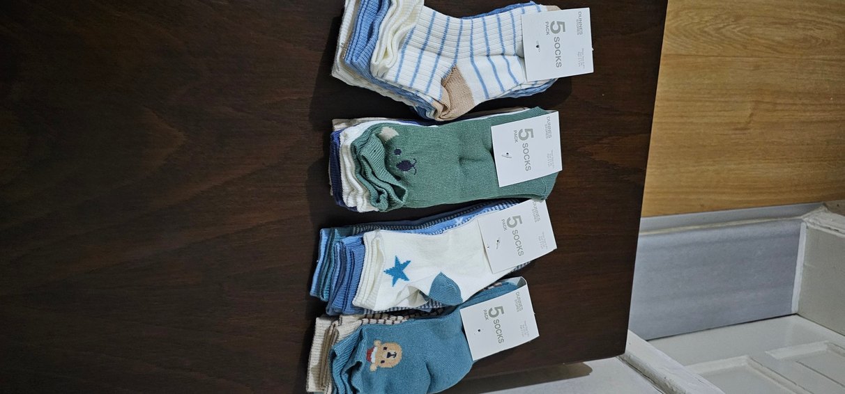 Nakışlı desenlere sahip açık mavi pamuklu kız çocuk çorapları. Her sette 'SOCKS' etiketiyle beş çift çorap bulunur.
