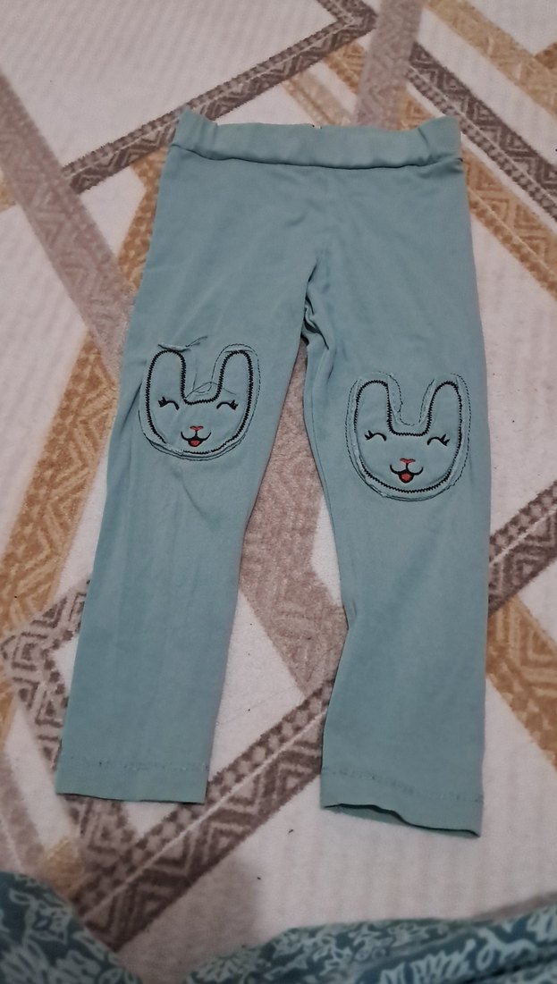 Mavi renk, elastik bel bandı ve dizlerde nakışlı tavşan desenleri olan, yumuşak ve sıcak kumaştan yapılmış kız çocukları için rahat kesim tayt.