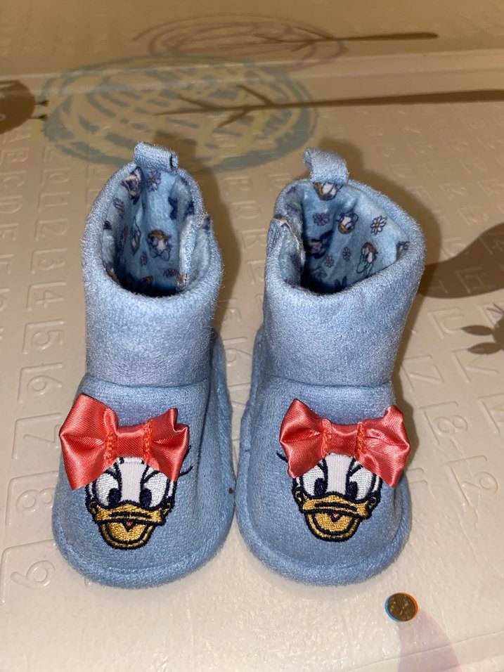 Kız çocukları için mavi yumuşak kumaştan, nakışlı karikatür desenli ve kırmızı tokalı fiyonk detaylı sıcak panduflar. 0-3 ay için uygun 0 ürün hiç denenmedi