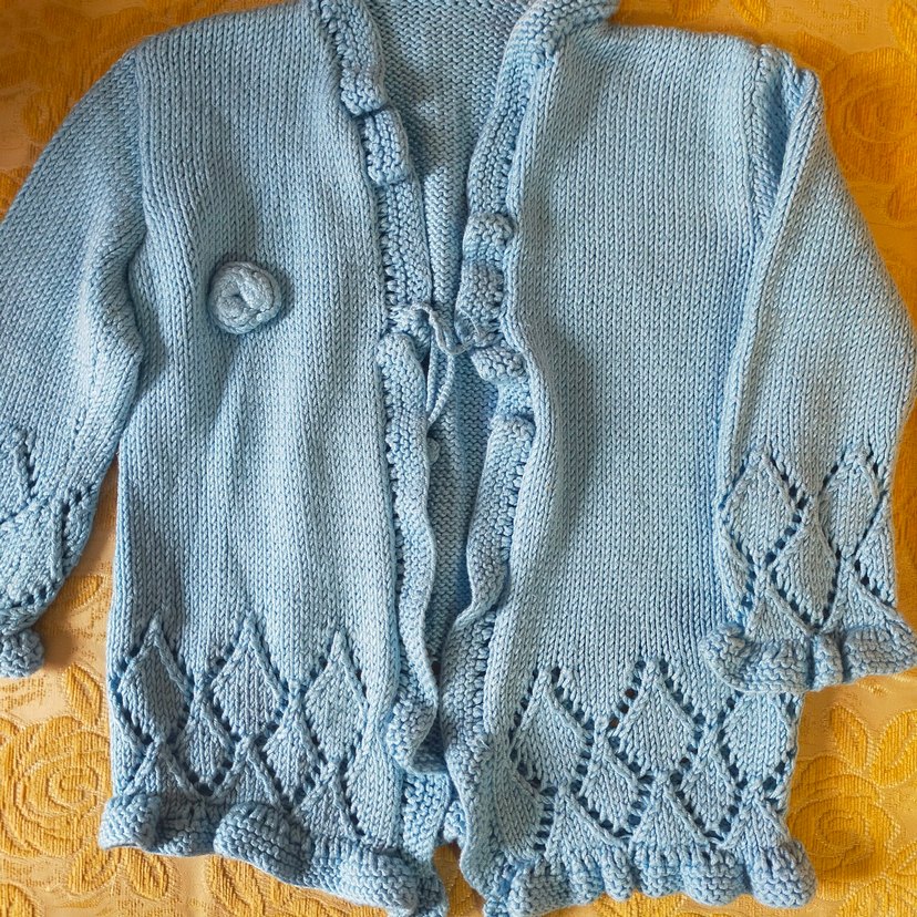 Mavi renkli, uzun kollu, örgü bohem tarzda kız çocuk hırkası. Rahat kesimli ve kenarlarında desenli örgü detayları bulunur. Yumuşak ve sıcak tutan .