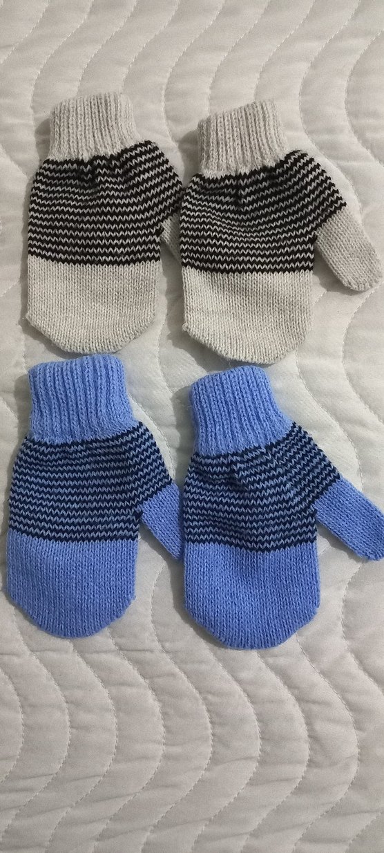 Mavi ve gri renklerde, örgü kız çocuk eldiveni. Düz ve desensiz sade tasarıma sahip, yumuşak ve sıcak tutan kumaş.