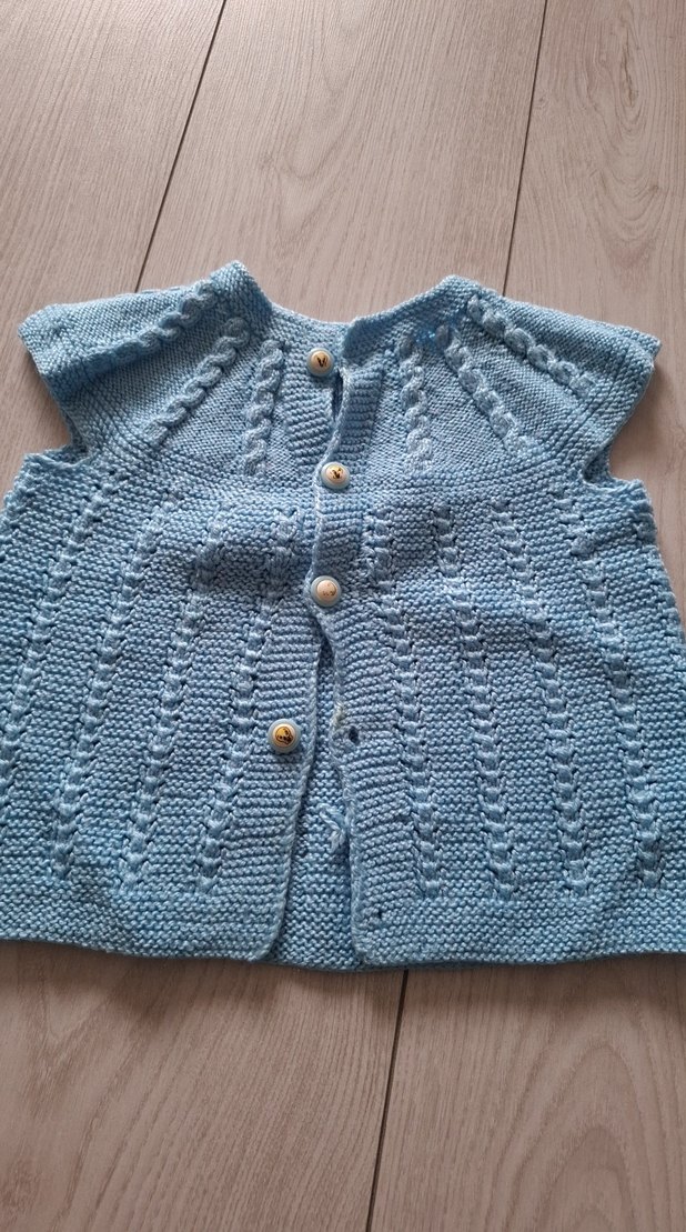 Mavi renkli, bohem tarzda, yuvarlak yakalı, düğmeli, örgü ve kolsuz kız çocuk yeleği. Rahat ve bol kesimdir.