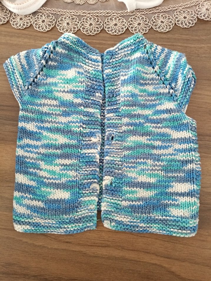Kız çocuk için pastel tonlarda mavi, örgü dokulu, kolsuz ve bohem tarzda, dar kesim yelek. düğmeleri degisecek