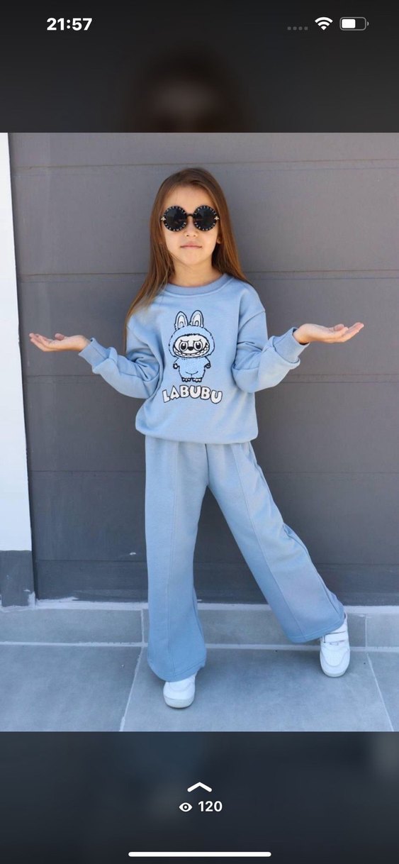 Kız çocuk oversize eşofman takımı, uzun kollu ve bisiklet yaka. Yumuşak kumaş, kabarık tasarım ve mavi-gri batik desenli. Önünde 'LABUBU' baskısı bulunur.