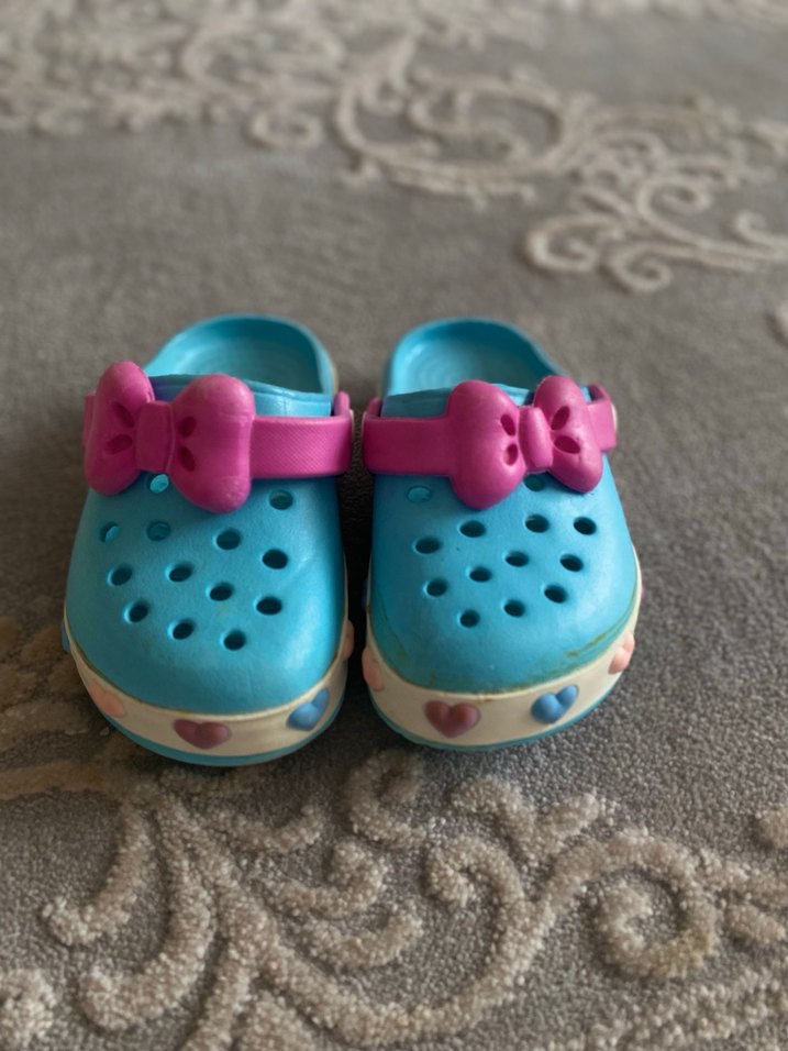 Renkli mavi kauçuk kız çocuk terliği, pembe papyon detayları ve tabanda kalp desenleriyle pop kültür tarzında.