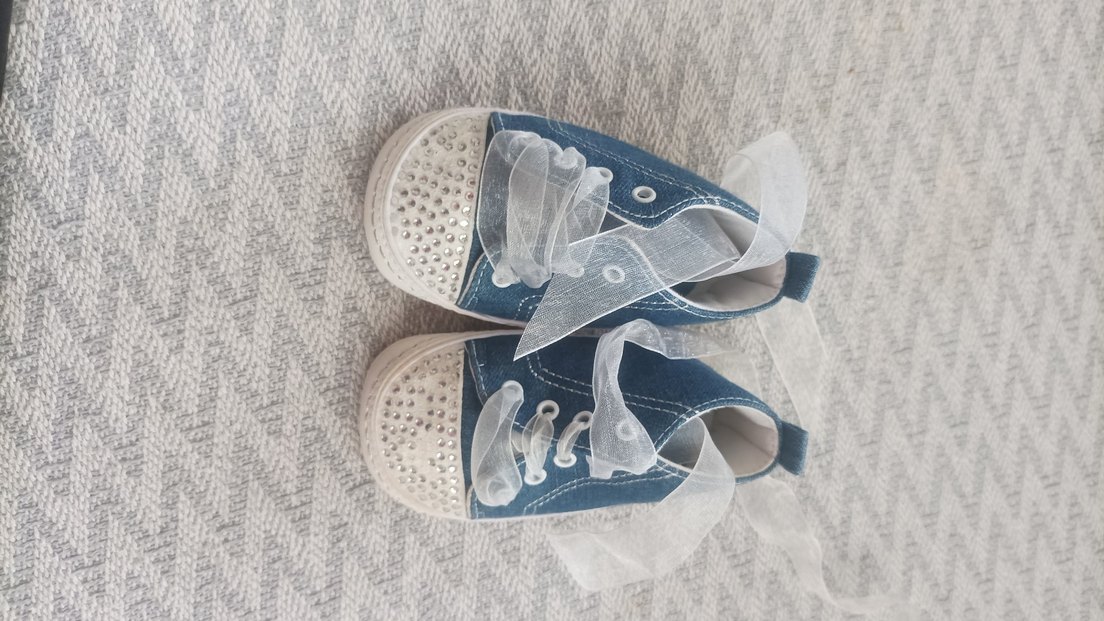 Mavi denim kumaştan yapılmış, payet detaylı ve şeffaf kurdele bağcıklı kız çocuk ayakkabısı.