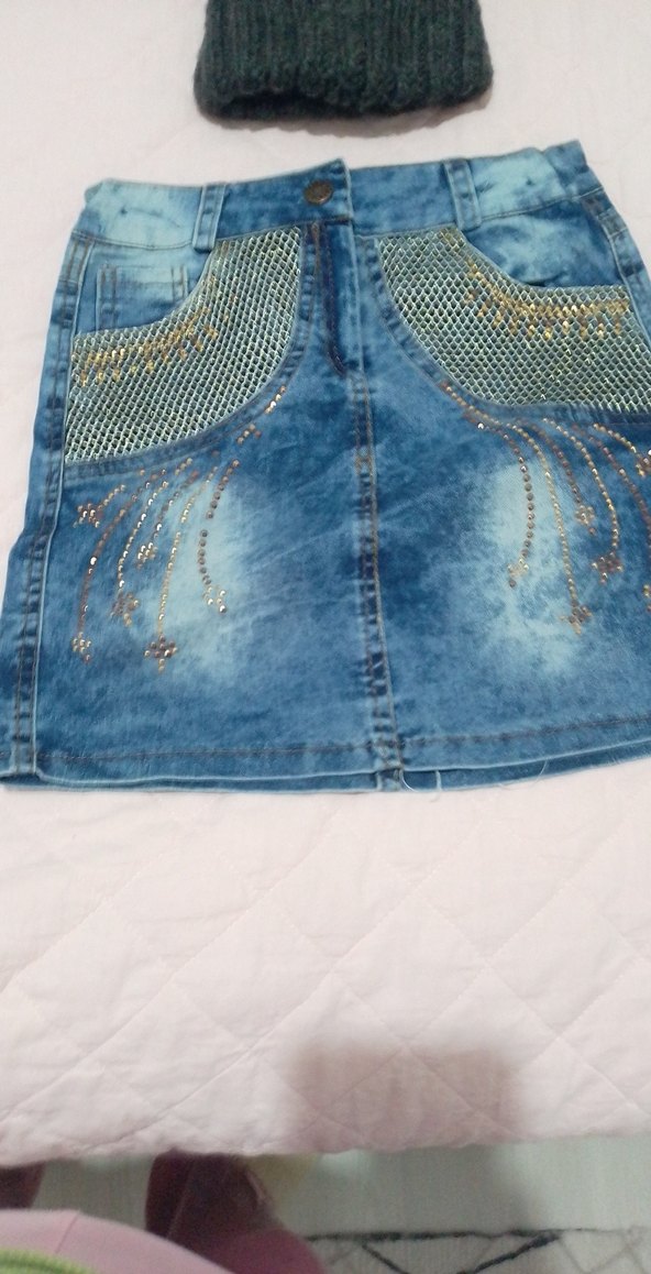 Kız çocuk için mavi denim etek, parlak payet nakışlı ve dar kesim. Sokak modasına uygun, detaylı cep süslemeleriyle trendy casual tarzda.