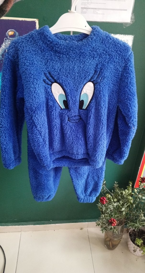 Mavi, uzun kollu kız çocuk sweatshirtü, nakışlı renkli göz detayları ve yumuşak, kürk dokulu kumaş ile rahatlık sağlar. Bisiklet yaka, günlük tarzı tamamlar. 4 yaş bebe kullanabilir