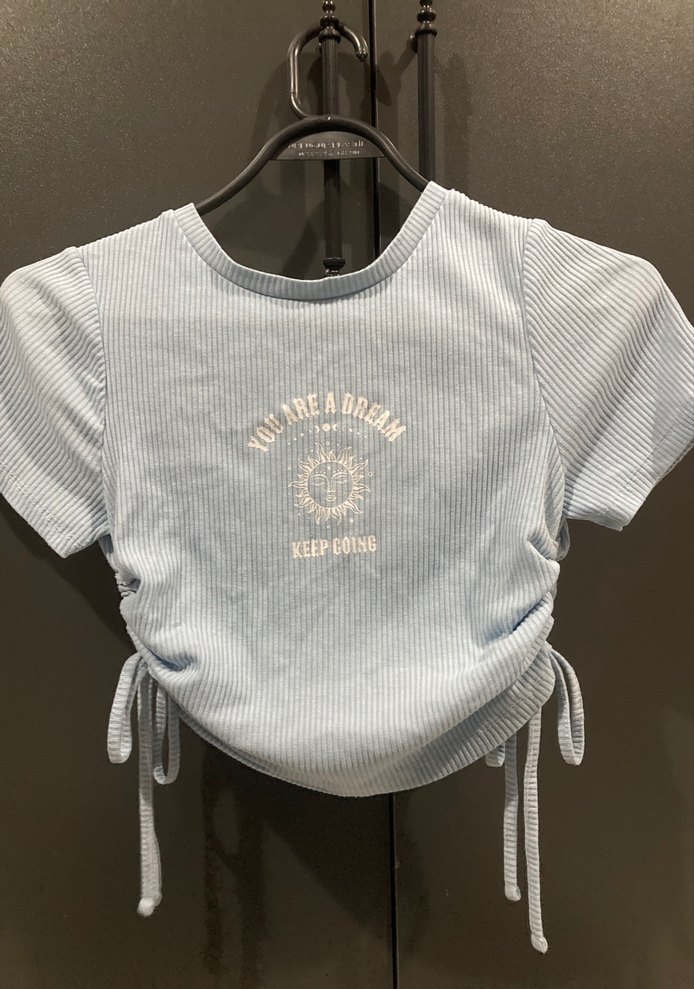 Pastel mavi renkte, kısa kollu, yuvarlak yaka, piliseli yan bağcık detaylı fitted kız çocuk kot tişört. Önde baskılı yazılar bulunur. Trend sokak stili için uygun.