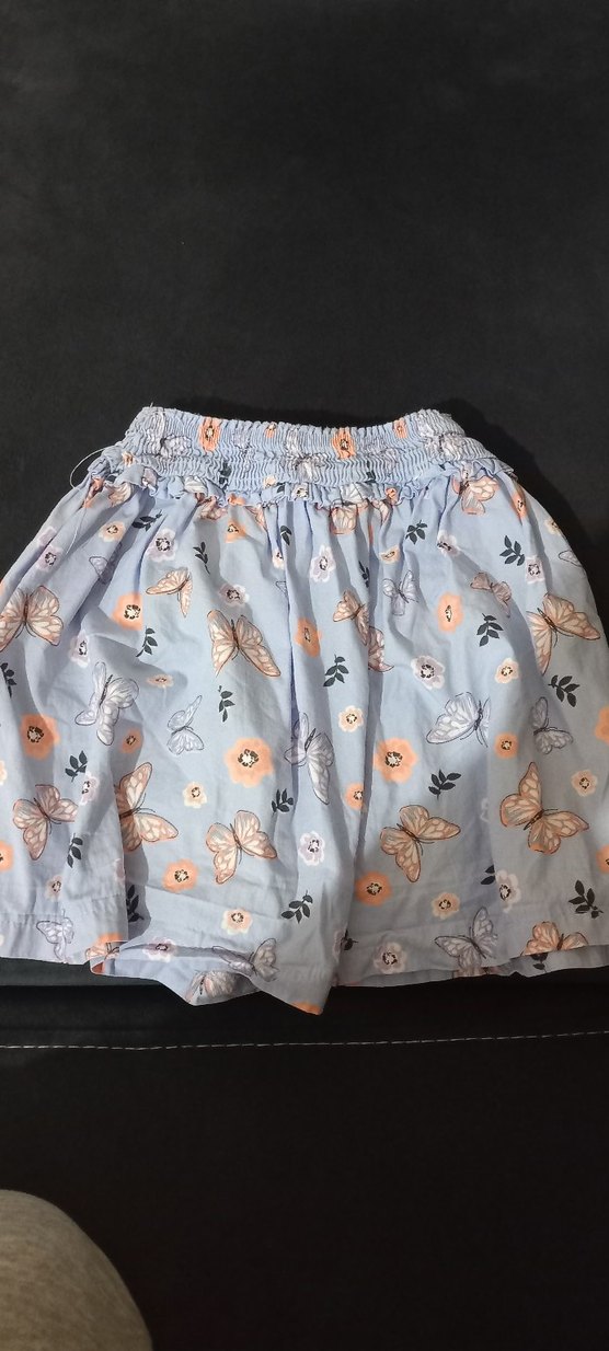 Mavi, pastel kelebek ve çiçek desenli, sentetik yumuşak kumaştan yapılmış, bol kesim pliseli kız çocuk eteği. Bohem sokak stili için uygun.