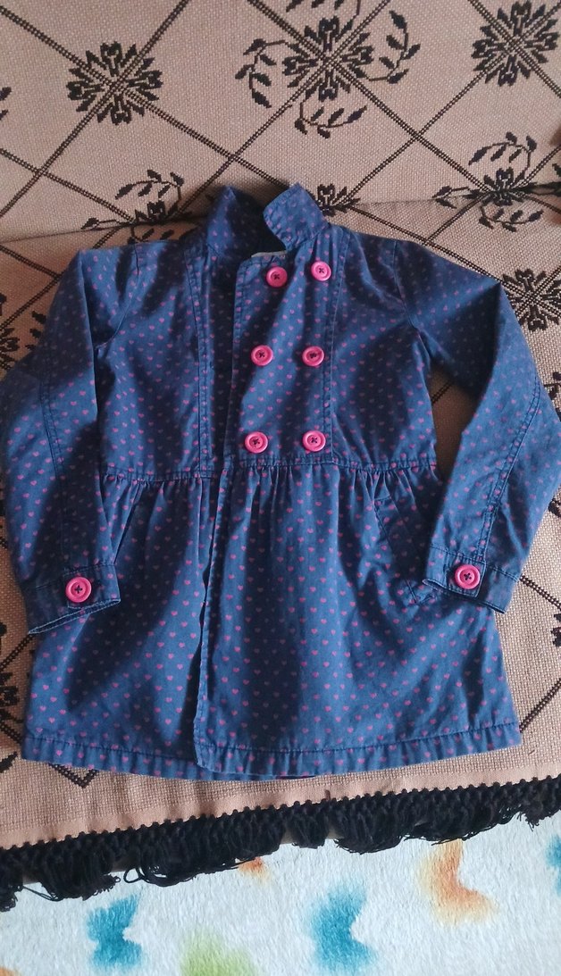 Rahat kesim kız çocuk mavi denim ceket, renkli puantiyeler ve pembe düğmelerle. Notch yakalı, gündelik ve trend bir tarz sunar.