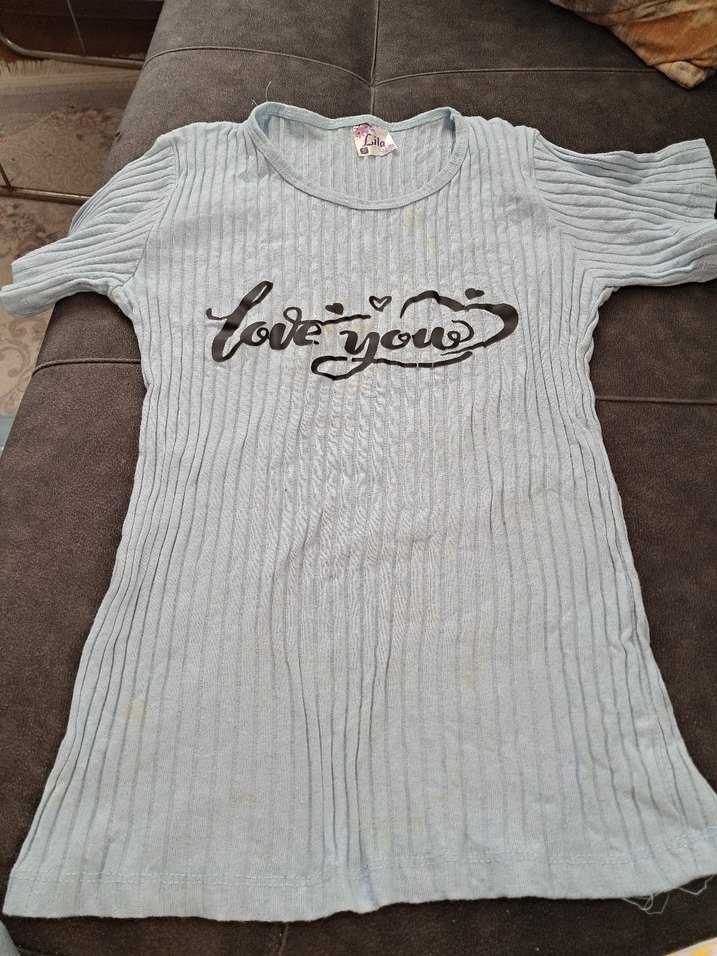 mavi renkli, triko dokuda, kısa kollu ve bisiklet yaka kız çocuk tişörtü. Önünde 'love you' yazılı baskı , trend sokak stili için uygundur.