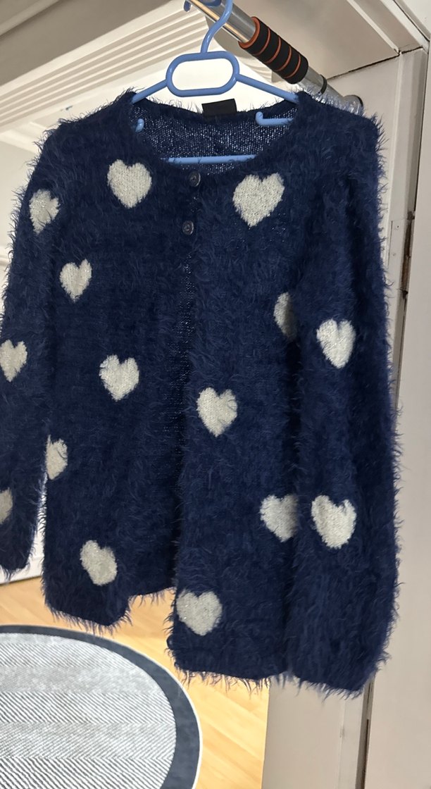 Uzun kollu, tüylü mavi örme hırka, beyaz kalp desenleriyle rahat ve salaş bir görünüme sahiptir.