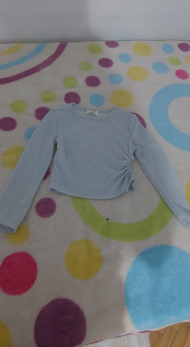 Kız çocuk için mavi, uzun kollu ve düğmeli, yumuşak ve sıcak kumaştan yapılmış dar kesim tişört. Pastel tonlarda ve hafif batik desenli.