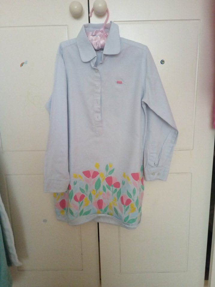 Pamuklu, uzun kollu, düğmeli ve yakalı kız çocuk gömleği. Bol kesimli, pastel mavi ve alt kısmında renkli çiçek baskısı bulunur. lekesi var makul fiyat koydum