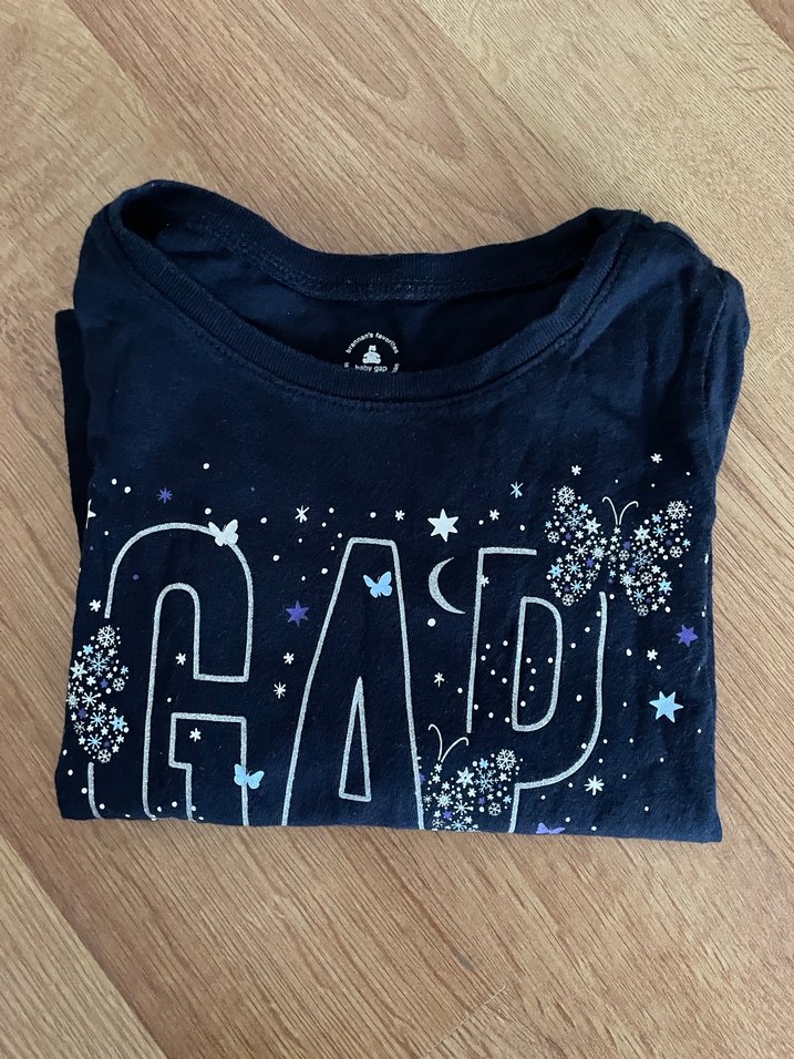 Yumuşak pamuktan, bol kesim mavi uzun kollu kız çocuk tişörtü. Parlak kelebek ve yıldız baskıları, yuvarlak yaka, rahat sokak stili için uygun.