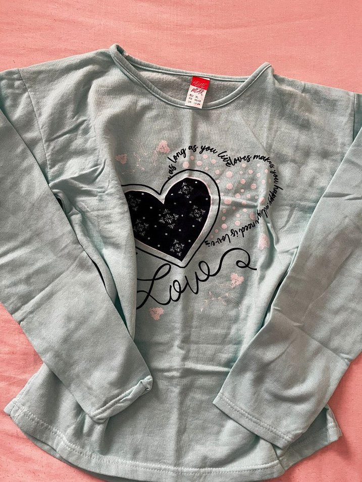 Bu kız çocuk uzun kollu tişört, bol kesim ve yuvarlak yaka ile pastel mavi renktedir. kalp ve 'love' yazılı baskı, yumuşak ve sıcak kumaştandır.