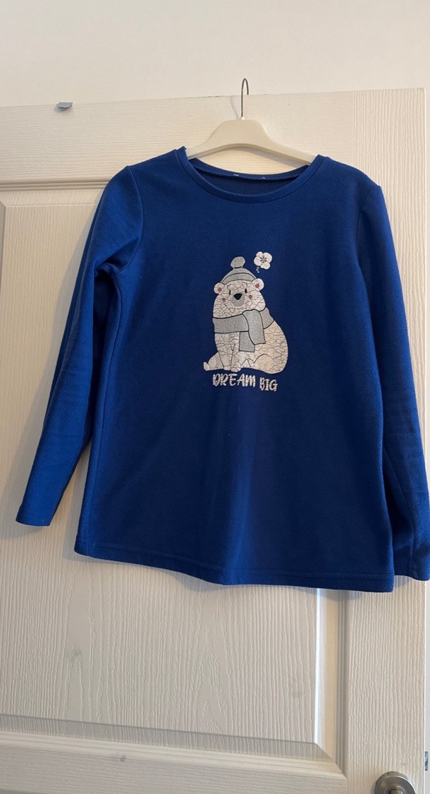 Koyu mavi renkli kız çocuk sweatshirtü, uzun kollu ve bisiklet yaka. Bol kesim ve yumuşak örme kumaştan. Önünde 'DREAM BIG' yazılı ayı baskısı bulunur.