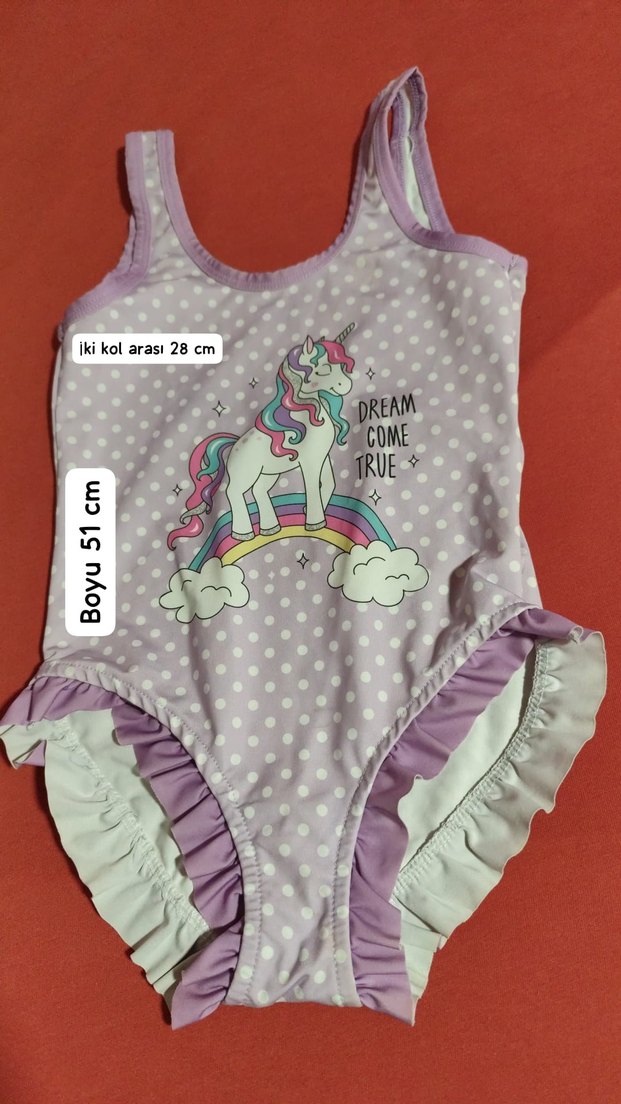 Kolsuz, mor renkli, pastel puantiyeli ve 'DREAM COME TRUE' yazılı unicorn baskılı mayo. Yanlarda fırfır detaylı, boyu 51 cm, iki kol arası 28 cm.