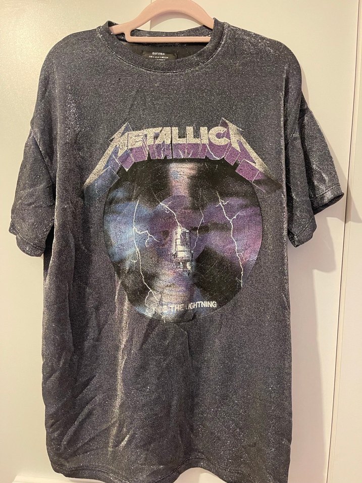Koyu gri keten kumaştan, metalik Metallica baskılı, kısa kollu, yuvarlak yakalı, bol kesim kız çocuk tişörtü. Rock punk tarzını yansıtır.
