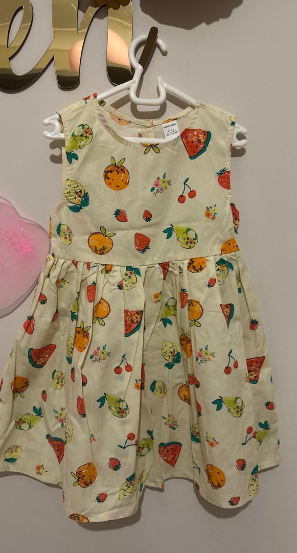 Kolsuz, bol kesim, pileli kız çocuk elbisesi. Açık renkli kumaş üzerinde çok renkli meyve desenleri yer alır.