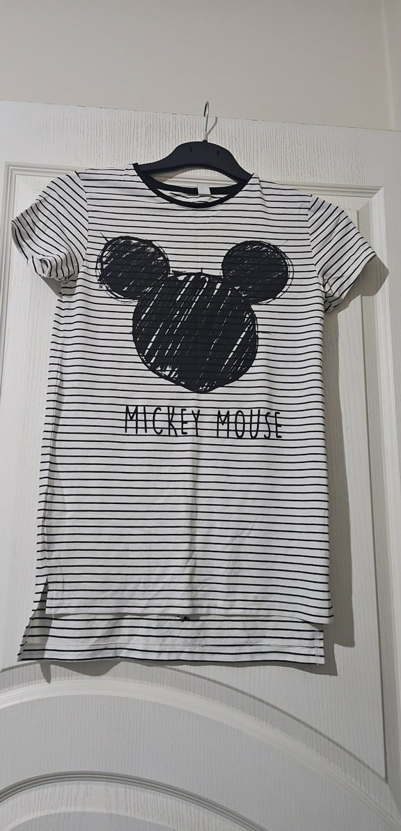 Kız çocuk tişörtü, kısa kollu ve yuvarlak yakalıdır. Pamuklu kumaştan üretilmiş, gri-beyaz çizgili ve önünde büyük Mickey Mouse baskısı vardır. Rahat kesimlidir.