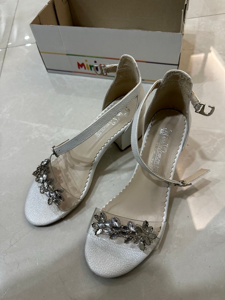 Beyaz, taşlı ve desenli abiye çocuk ayakkabısı, blok topuklu ve rahat kauçuk tabanlıdır. Sorunsuzdur, sayılı giyildi.