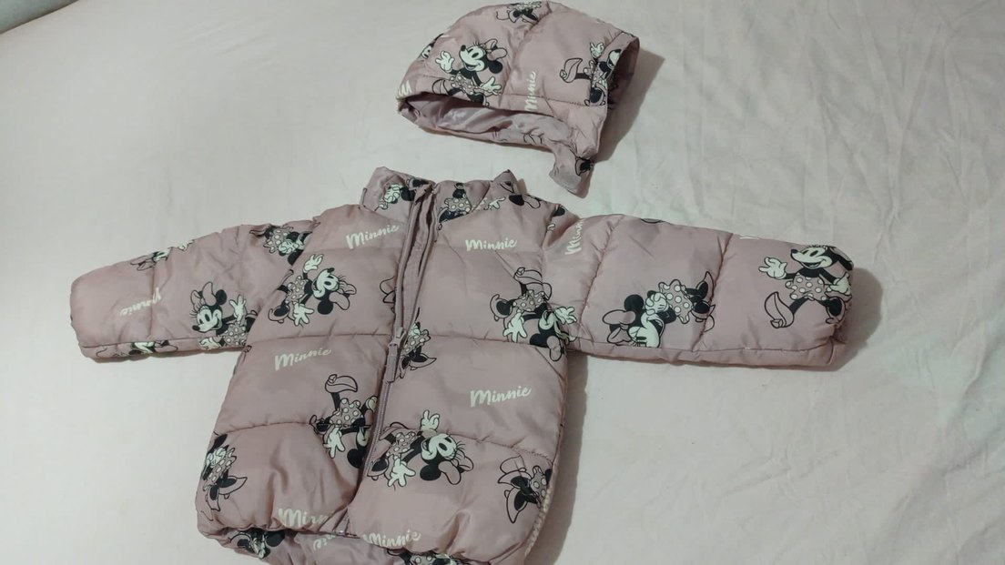 Kız çocukları için kapüşonlu, fermuarlı ve Minnie baskılı pembe-gri mont. Yumuşak sentetik kumaştan, trend sokak stiline uygun.