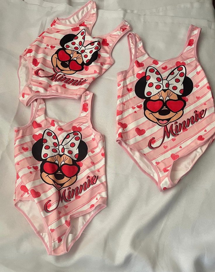 Kolsuz, kalpli ve çizgili desenli, renkli Minnie Mouse baskılı pembe mayo, parti için uygun. 3-4 4-5 5-6 6-7 8-9 yaş uygundur.