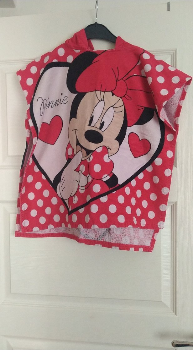 Kız çocukları için bol kesim, kısa kollu, renkli Minnie Mouse baskılı panço. Yuvarlak yakalı, cırt cırtlı, yumuşak ve sıcak kumaştan yapılmıştır.