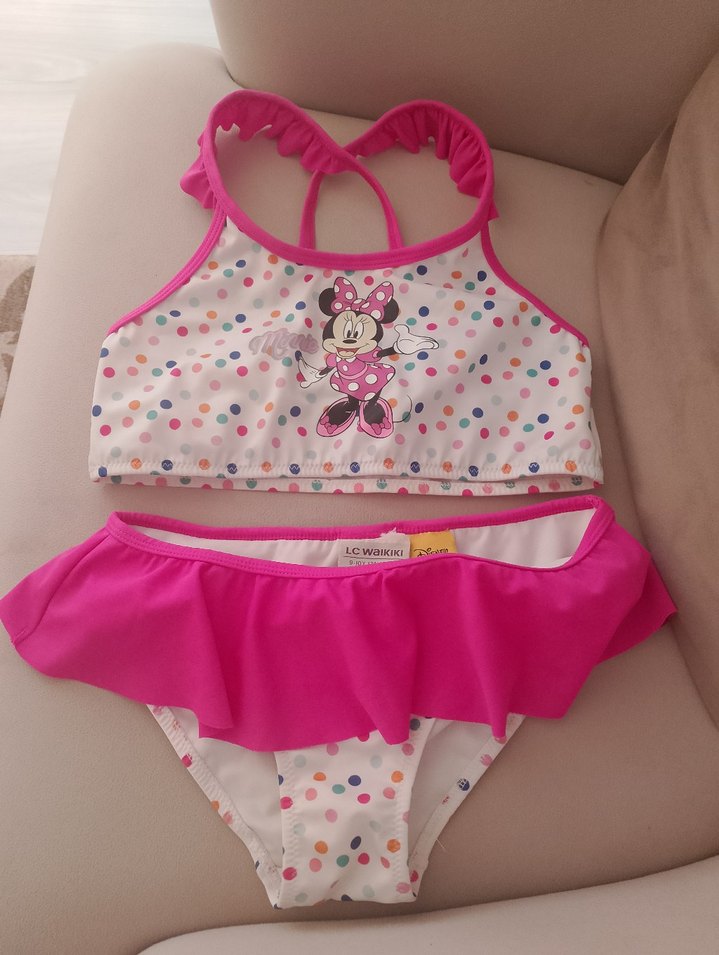 LC WAIKIKI DİSNEY. Çok renkli puanlı desene ve Minnie Mouse baskısına sahip kız çocuk bikini. Askılı üst kısmı ve pembe fırfırlı alt kısmı plaj için uygundur.