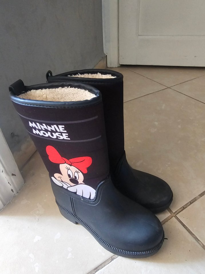 Kız çocuklar için renkli Minnie Mouse baskılı, cırt cırtlı siyah kauçuk bot. İçi sıcak tutan astarlı, sokak modasına uygun rock punk tarzında.