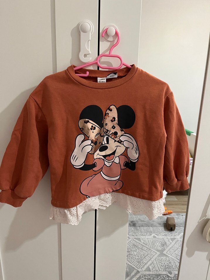 Kız çocukları için uzun kollu, yuvarlak yaka ve Minnie Mouse baskılı bol kesim sweatshirt. Pamuklu kumaştan, etek kısmında fırfır detayı bulunur. Rahat ve şık sokak stili için uygun.