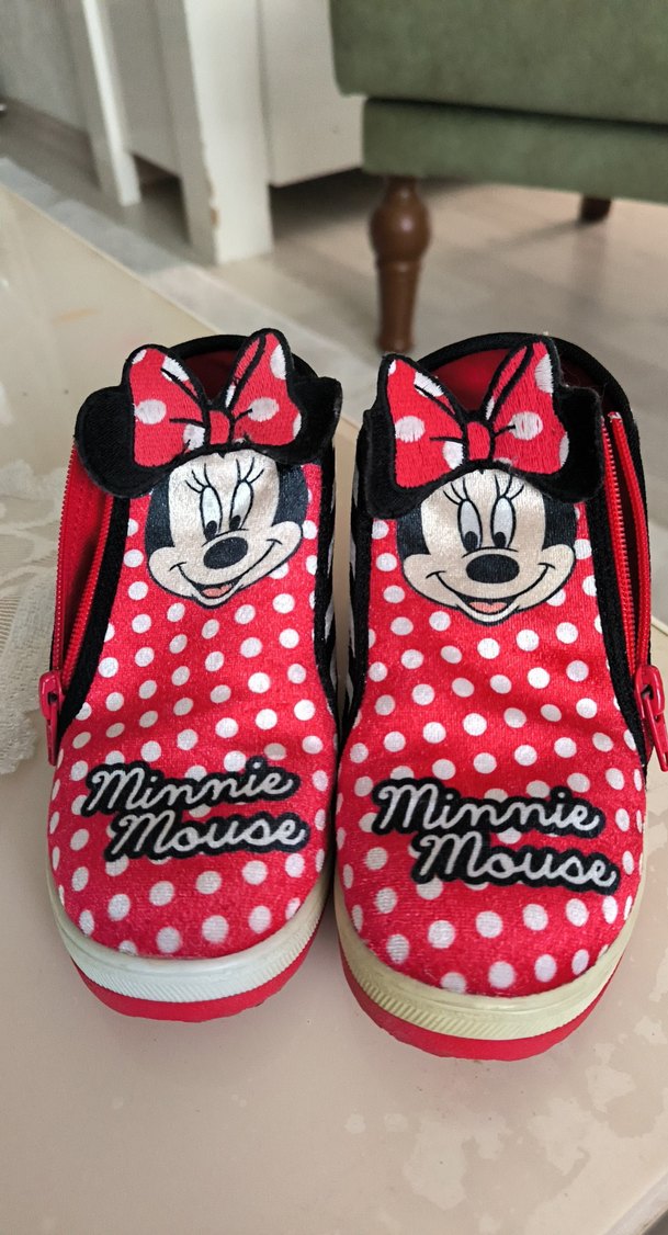 Minnie Mouse desenli, renkli kız çocuk terlikleri, kolay giyilebilen fermuarlıdır.Sıcak tutar ve rahatlık sunar. 1 defa giyildi.Temizdir.Yırtığı, söküğü yoktur.Alana şimdiden hayırlı olsun