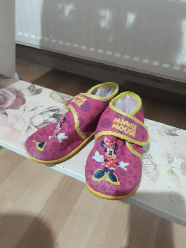 Renkli pembe Minnie Mouse baskılı, cırt cırtlı kız çocuk terlikleri. Kauçuk tabanlı, sıcak ve rahat kullanım sağlar.