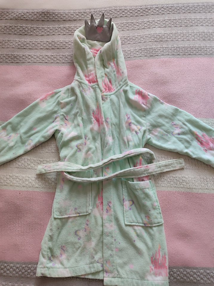 Yıkanmaktan pamuklanması dışında hiçbir sorunu yok. Çok taglı bir mint yeşili renginde, üzerinde unicorn, gökkuşağı, prenses ve taç desenleri var. Şapkasındaki tacı çok tatlı duruyor. 6-8 yaş için uygundur