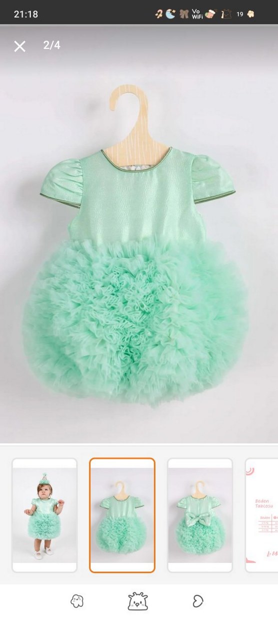 Kısa kollu, yuvarlak yakalı ve vücuda oturan elbise. Etek kısmı bol fırfırlarla hareketlendirilmiş,9-12 ay aldım ben mini dursun diye, sekiz kiloda kullandı, 1 kez giydi marka temsili