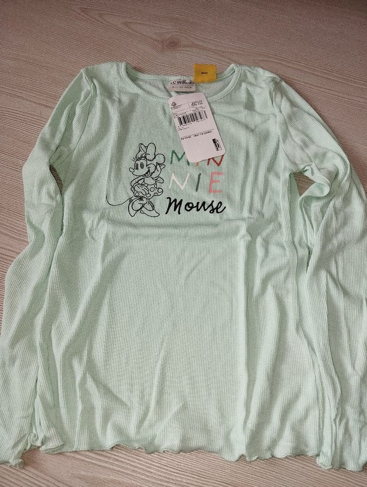 Mint yeşili uzun kollu, pamuklu ve örme dokulu kız çocuk tişörtü. Önünde Minnie Mouse baskısı bulunur, rahat ve salaş kesimlidir.