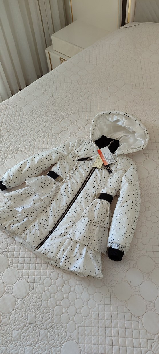 kız çocuk mont 5 yaş sıfır etiketli ürün. Kapüşonlu, detaylara sahip beyaz, siyah desenli, yumuşak kumaştan yapılmış kemer detaylı mont. Sokak modası ve avangart tarzı bir arada.