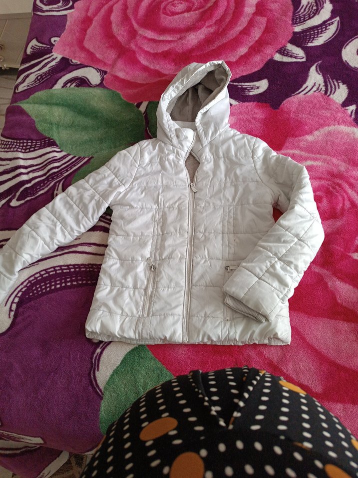 Beyaz, kapüşonlu ve fermuarlı kız çocuk mont.Uzun kollu, normal midi boyda, yumuşak ve sıcak kumaştan, temiz kullanılmıştır