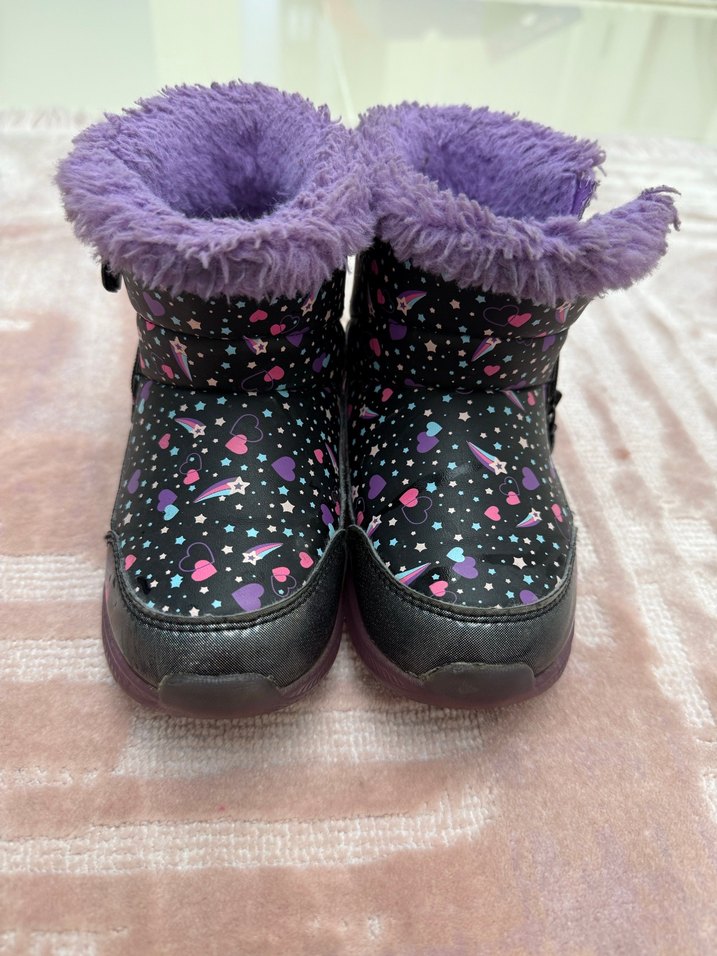 Skechers 25 numara Kız çocukları için koyu mor bağcıksız botlar, kauçuk malzeme ve yumuşak mor kürk astar içerir. Sıcacık tutar su geçirmezdir . Işıkları çalışır durumdadır