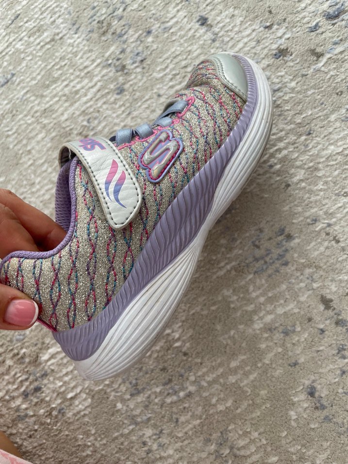 Mor ve gri tonlarında bağcıksız, cırt cırtlı Skechers kız çocuk spor ayakkabısı. Lastik tabanlı, rahat ve dayanıklı sokak stili ayakkabı.