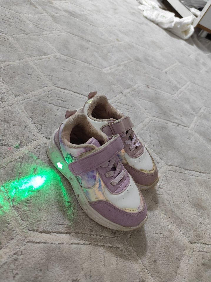 Mor tonlarında bağcıksız, cırt cırtlı kız çocuk spor ayakkabısı. Kauçuk tabanlı ve yanlarında yeşil ışıklar bulunur.