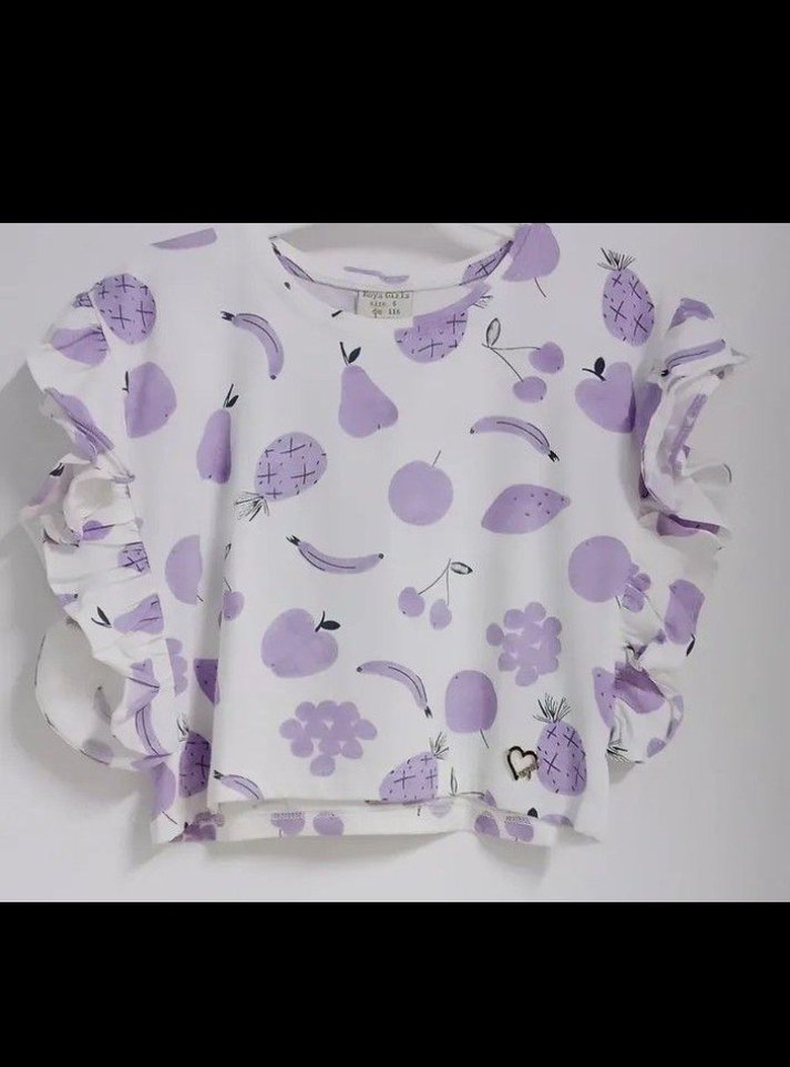 Kız çocuk tişörtü, pastel mor baskılı desenli, kısa fırfırlı kollu ve yuvarlak yakalıdır. Rahat kesimli, yumuşak ve sıcak dokulu kumaştan üretilmiştir.