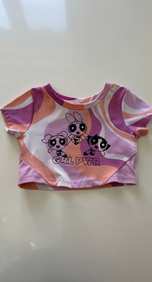 Kısa kollu, yuvarlak yakalı, mor pastel renkli baskılı kız çocuk crop Sentetik yumuşak kumaştan, bohem ve retro tarzı yansıtıyor.