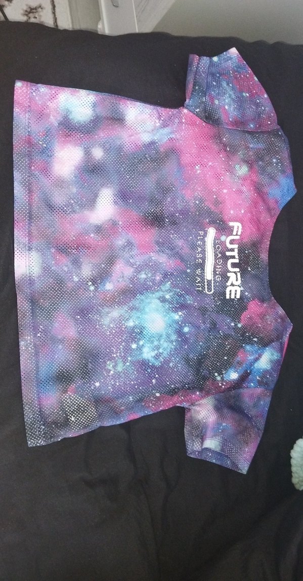 Koyu mor baskılı, kısa kollu, bisiklet yaka ve dar kesim kız çocuk tişörtü. Sentetik kumaştan, sokak modası tarzında "FUTURE" yazılı.
